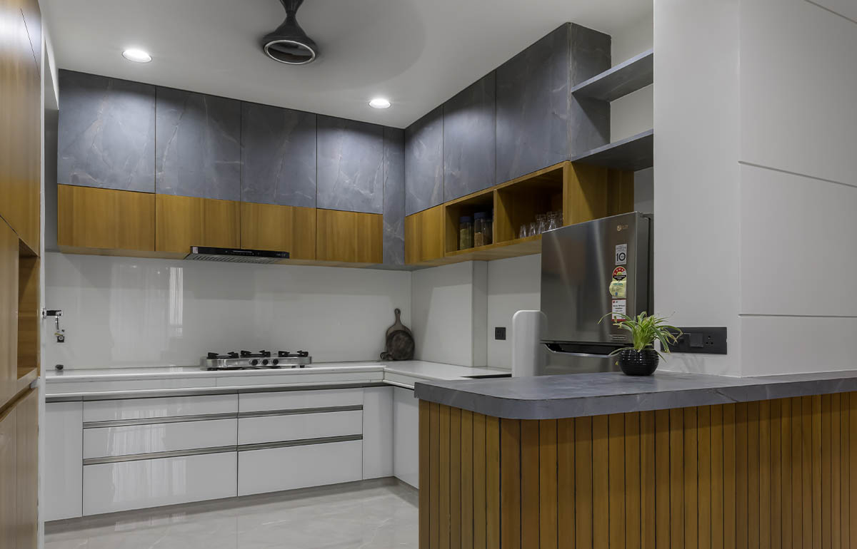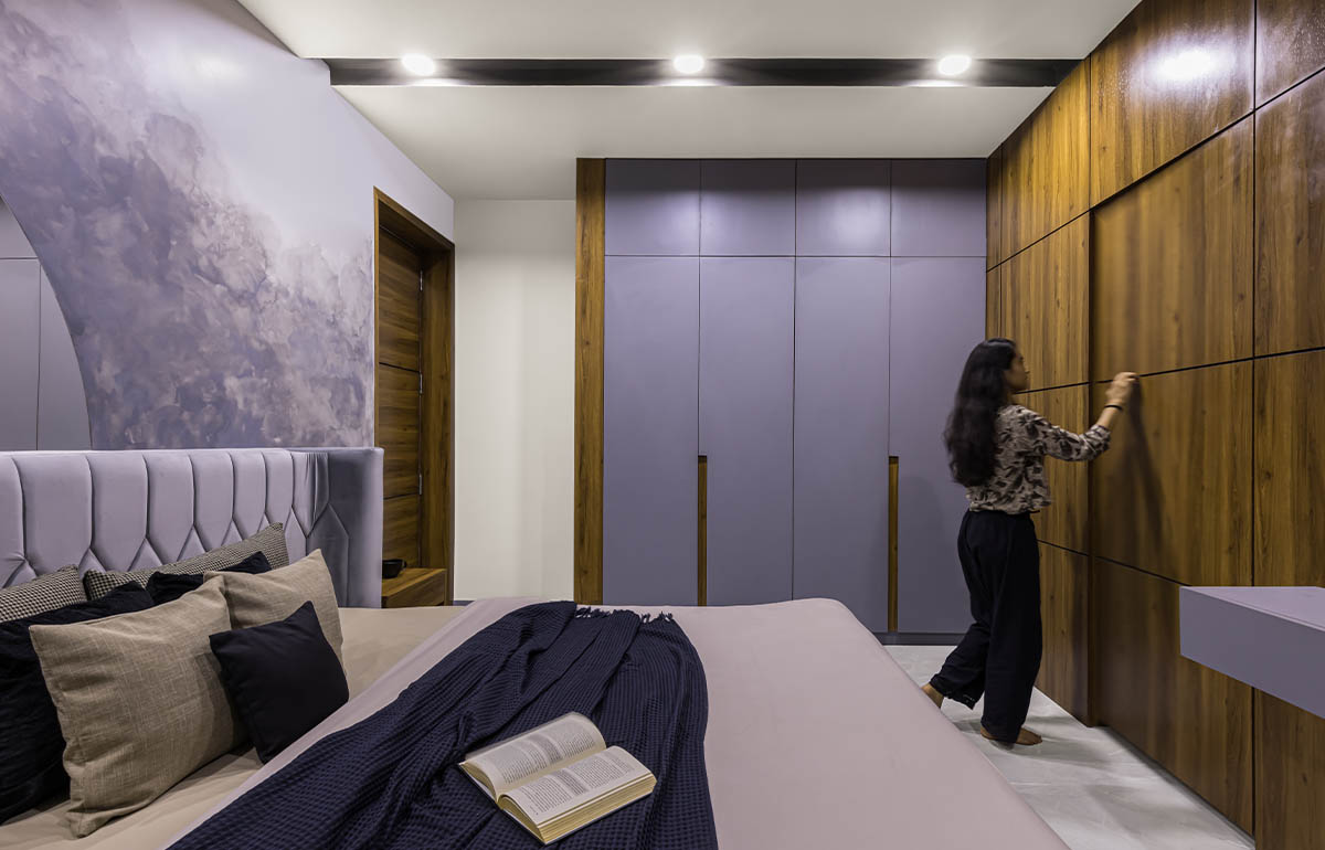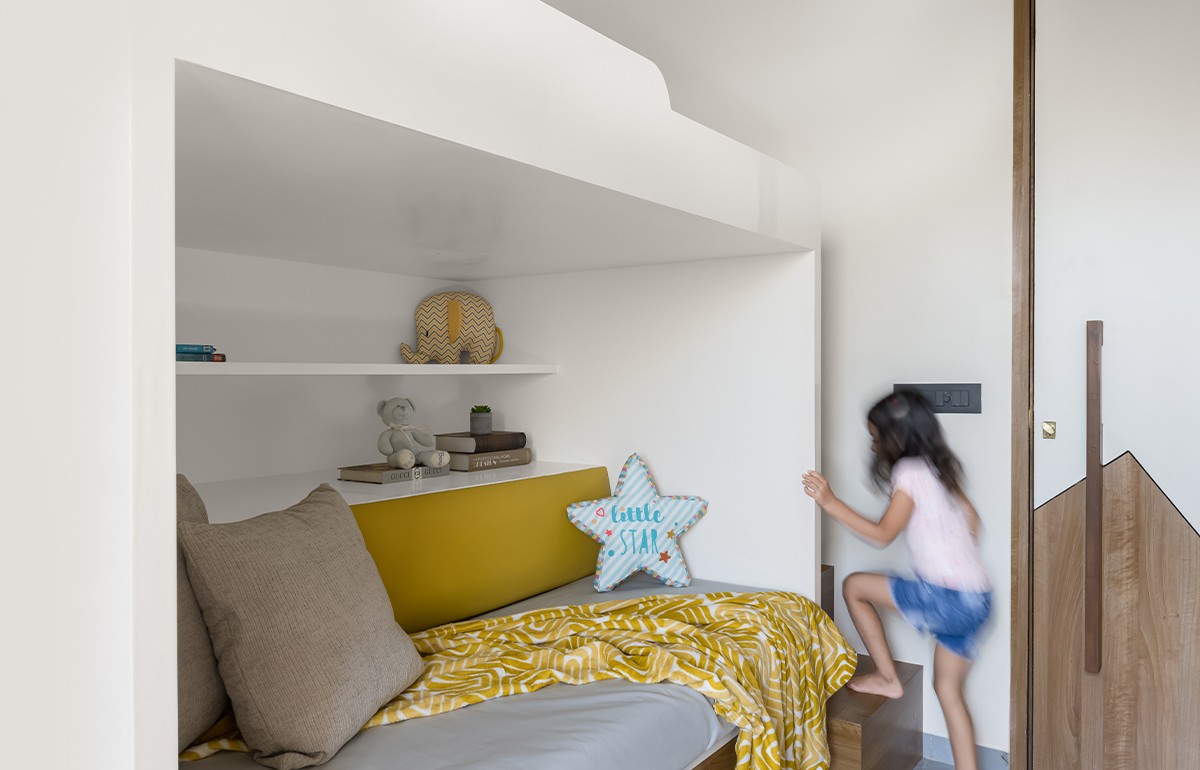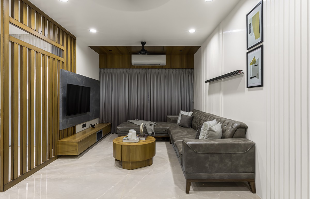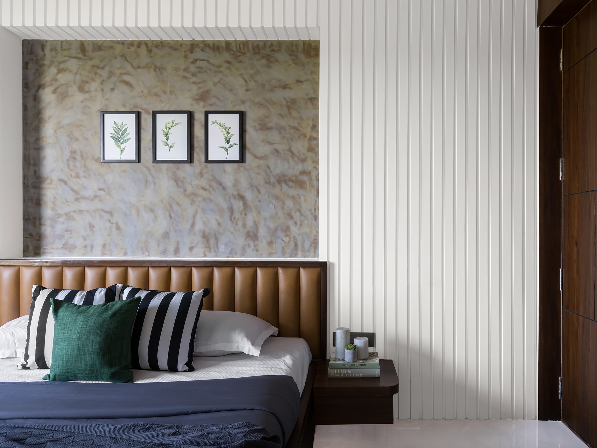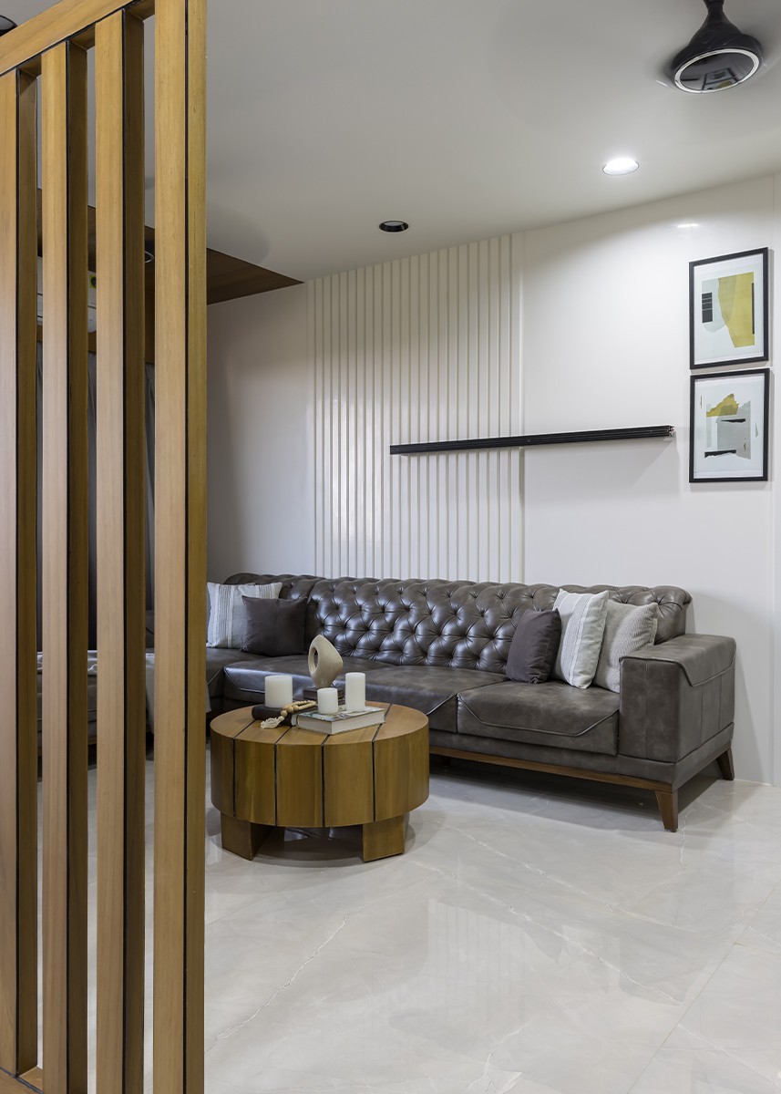 Text in right side in small fonts: (remove the headlines/titles of THE BRIEF, SCOPE OF WORK, etc.) Unit 503 is a thoughtfully designed 3BHK apartment where functionality meets quiet elegance. Designed within a modest budget, the space embraces a clean, minimal aesthetic while maximizing utility. The living room is warm and cozy, wrapped in subtle tones that create a calm atmosphere—anchored by a classic Chesterfield sofa that stands out as the room ’s centerpiece. The kids’ bedroom features a custom bunk bed to optimize space, while the master bedroom is elevated with a bold headboard and smart hidden storage.